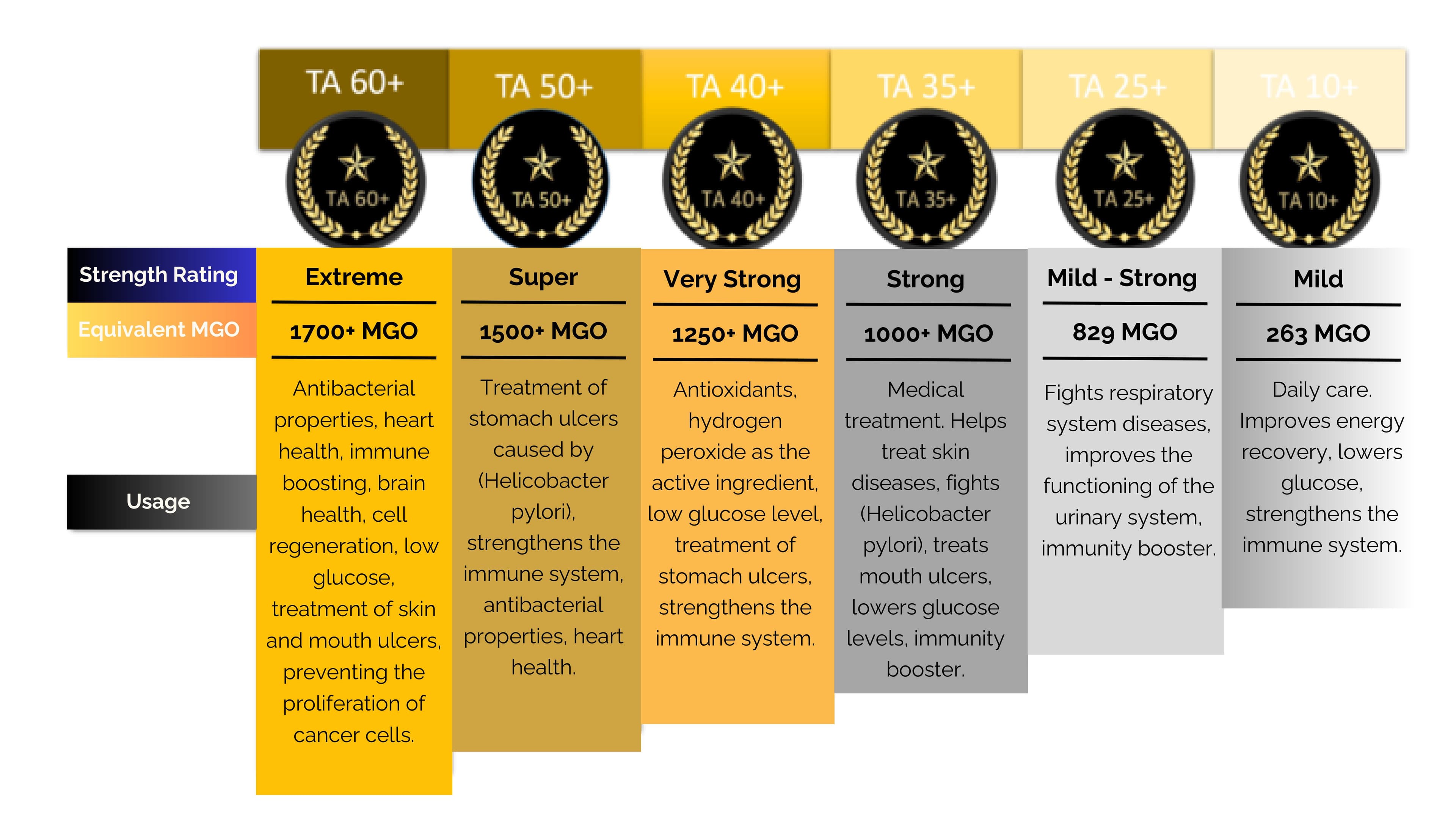TA 30+ is recognized as medicinal grade, while TA 40+ to TA 50+ represents elite therapeutic strength — among the most powerful healing honeys in the world.
